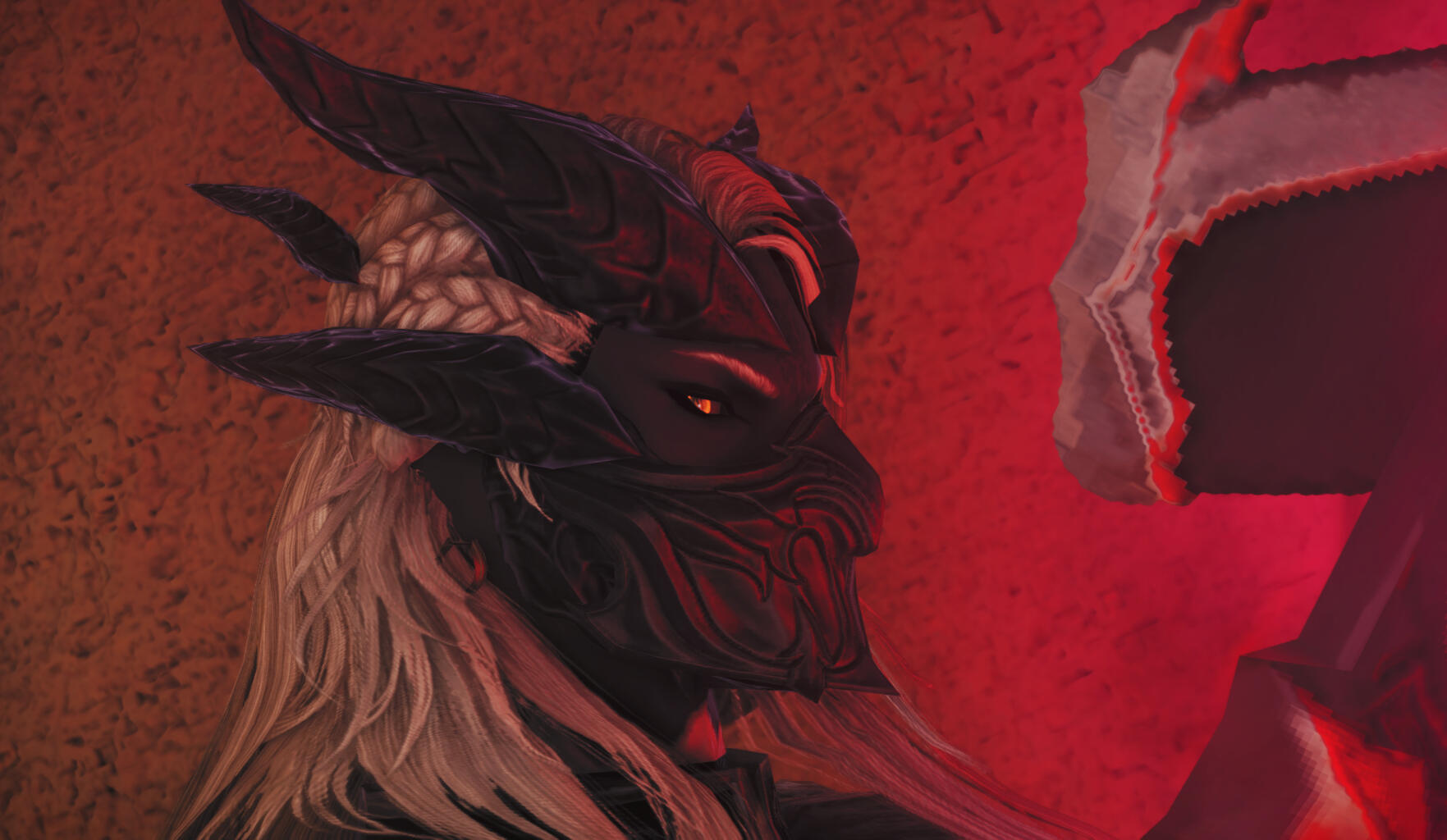 Sleek dark horns curve backwards from a scaled brow and cheekbones, and jut free from bound pale locks-bound with clasps that also line their throat with small-segmented bones confined within the metal. A pattern is tattooed into their forehead, faint ink against dark skin.